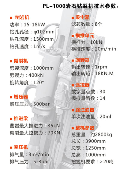 目前烈巖科技有限公司生產的巖石鉆裂一體機已經研發升級到第四代,PL1000型適配挖掘機噸位,25噸~38噸,日產噸位約1000噸;PL2000型適用挖掘機噸位:48噸~60噸,日產噸位約2000噸.